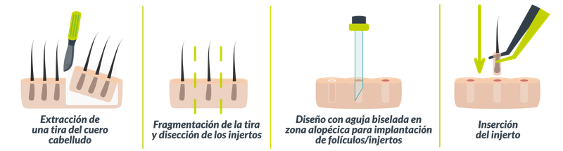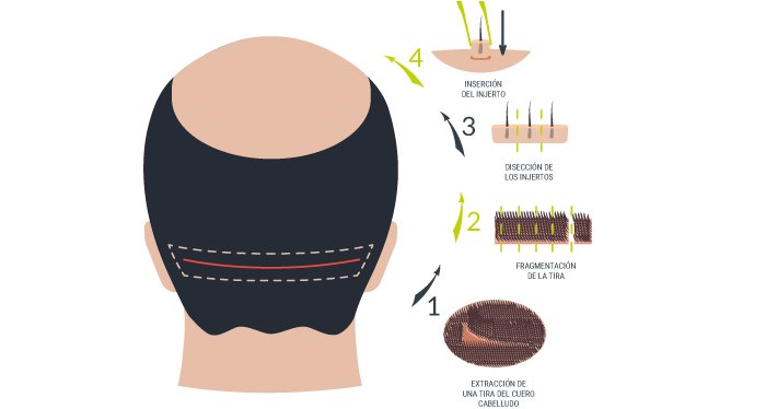 En la técnica FUSS se extrae una “tira” de cuero cabelludo sano de la zona donante, con una longitud de entre 15 y 20 centímetros (dependiendo del número de folículos a extraer) y un ancho de 1 a 1,5 centímetros (según la elasticidad de la piel de cada paciente).