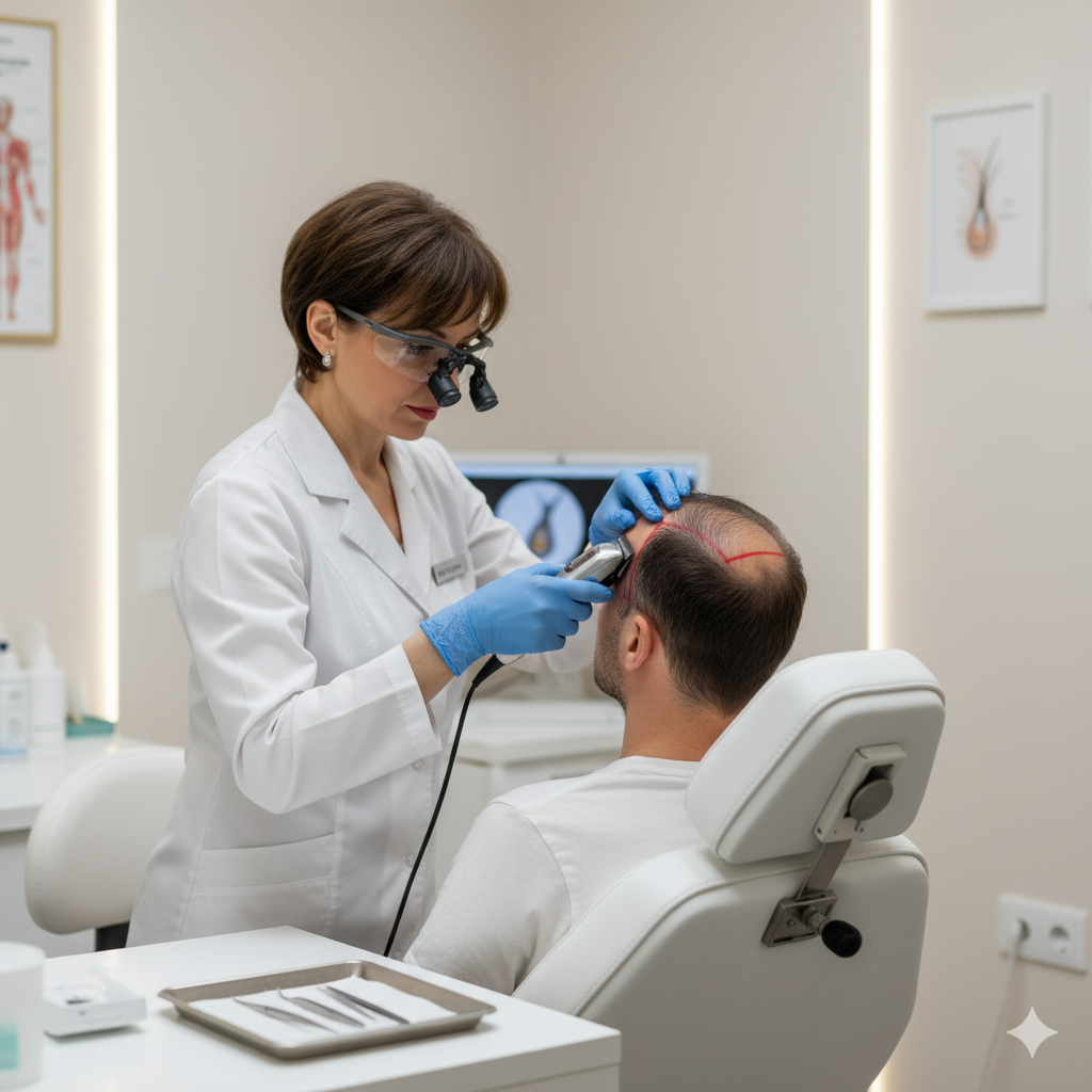 En la primera etapa de la cirugía, se aplica anestesia local avanzada para asegurar tu confort total en la piel para proceder a extraer la tira de cuero cabelludo con las unidades foliculares de la zona de la nuca (zona donante).
