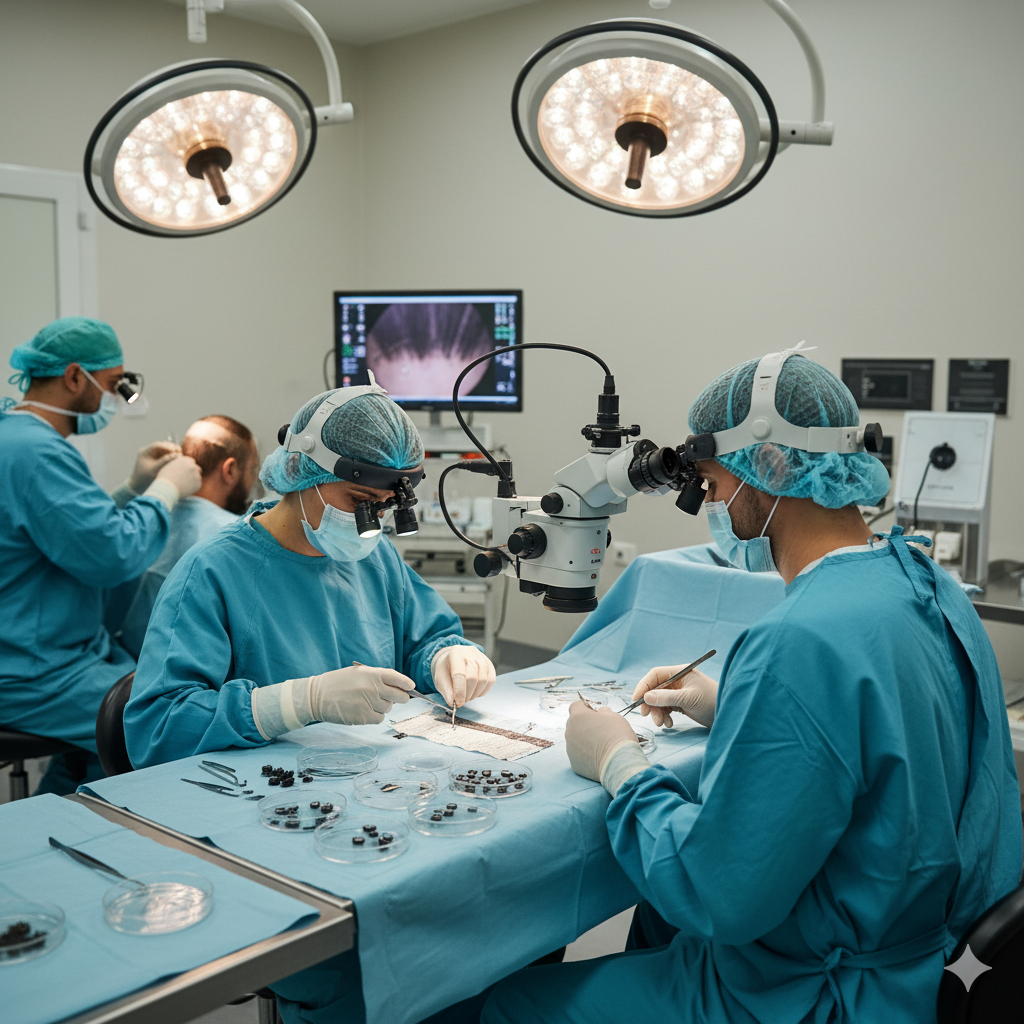 De esta tira, los folículos se separan individualmente bajo un microscopio de alta resolución por nuestro equipo especializado, lo que permite aprovechar prácticamente el 100% de los injertos disponibles con una mínima tasa de daño folicular. Posteriormente, las unidades foliculares se trasplantan una a una en la zona calva, logrando una implantación natural de cabellos definitivos que crecerán de forma permanente.