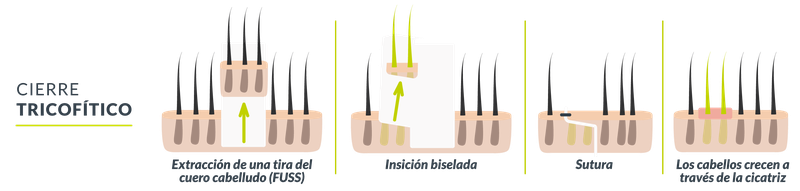 Una vez extraída la tira se procede a suturar la zona donante mediante cierre tricofítico, uniendo los bordes del cuero cabelludo, donde quedarán puntos de sutura que deben ser retirados a los 10 días en nuestra clínica.